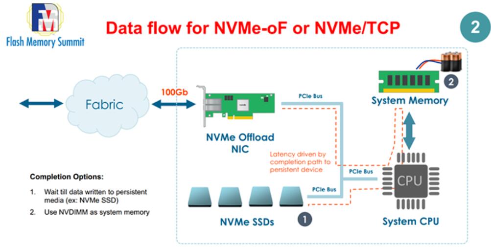 以下圖片是傳統(tǒng)的NVMe-oF的數(shù)據(jù)流,要通過系統(tǒng)內(nèi)存和CPU再進(jìn)入NVMe SSD,這樣會導(dǎo)致讀寫延遲比較長。
