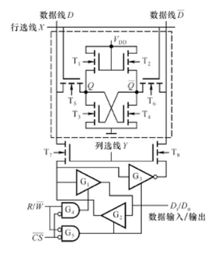 其中存儲單元通過T5、T6和數據線(位線)相連;數據線又通過T7、T8和再經輸入/輸出緩沖電路和輸入/輸出線相連接,以實現信息的傳遞和交換。寫入信息的操作過程,在第一次寫入信息之前,存儲單元中的信息是隨機信息。